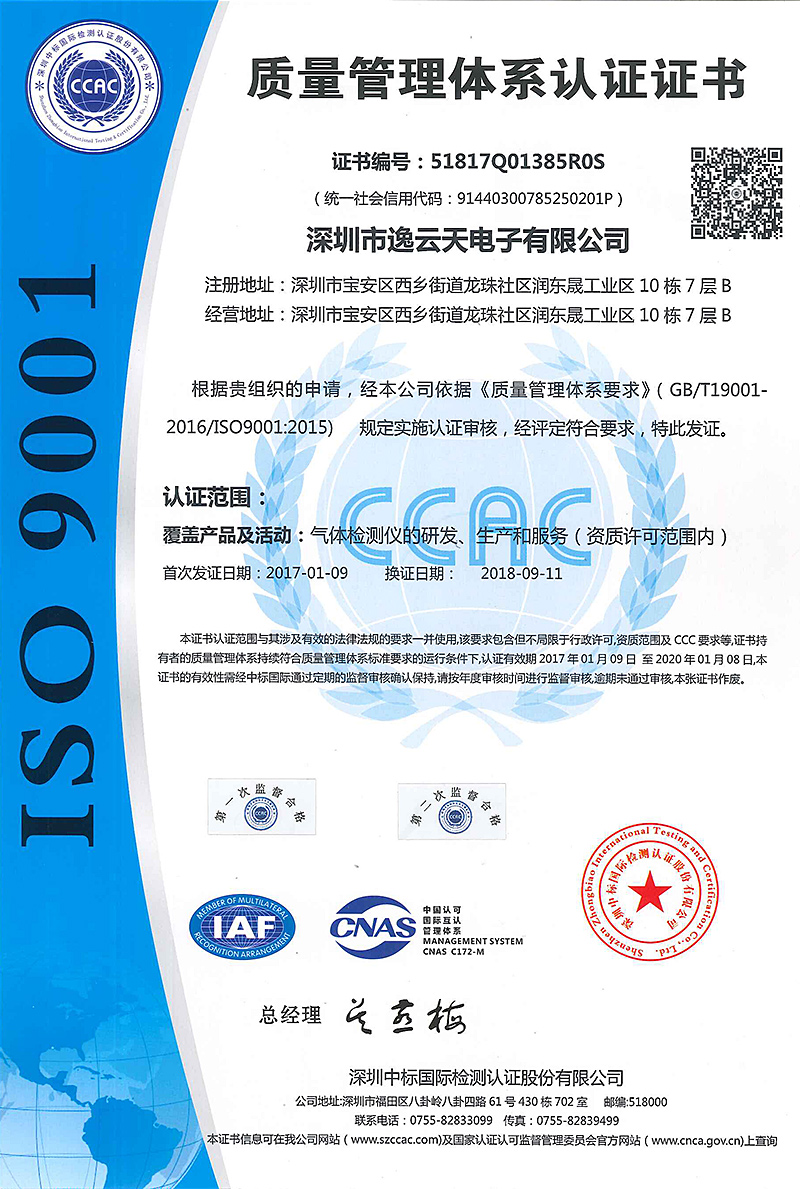 深圳市逸云天電子有限公司成立于2006年初,是集設(shè)計(jì)、研發(fā)、生產(chǎn)、銷售于一體的國家高新技術(shù)企業(yè)??商峁┯卸居泻?、易燃易爆氣體檢測報(bào)警儀、氣體分析儀、氣體在線監(jiān)測預(yù)處理系統(tǒng)、VOCs在線監(jiān)測系統(tǒng)、微型空氣監(jiān)測站、惡臭在線監(jiān)測系統(tǒng)、差分紫外光譜氣體分析儀、激光氣體分析儀、環(huán)保安監(jiān)氣體監(jiān)測云平臺等產(chǎn)品。逸云天已通過ISO9001質(zhì)量管理體系認(rèn)證、IS014001環(huán)境管理體系認(rèn)證、ISO45001職業(yè)健康安全管理體系認(rèn)證、CCEP中國環(huán)保產(chǎn)品認(rèn)證;并取得相應(yīng)產(chǎn)品防爆合格證、CPA型式批準(zhǔn)證書、消防產(chǎn)品認(rèn)證證書、外觀專利證書、軟件著作權(quán)登記證書等。本公司產(chǎn)品已經(jīng)在石油、化工、燃?xì)廨斉洹}儲、市政燃?xì)狻⑾?、環(huán)保、冶金、生化醫(yī)藥、能源電力等行業(yè)得到了廣泛的應(yīng)用,并得到廣大客戶的一致認(rèn)可。
